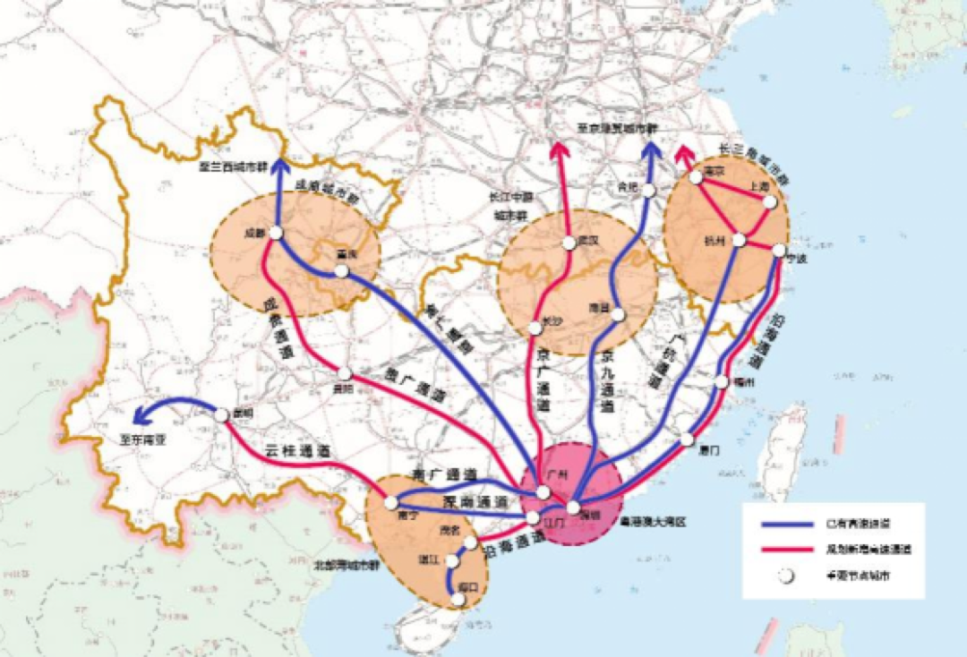 着力打造京广深港、赣深、贵广-南广、沿海(厦深)、珠江-西江五大铁路走廊,完善“南北终到、东西贯通、互联互通”高铁通道布局。
