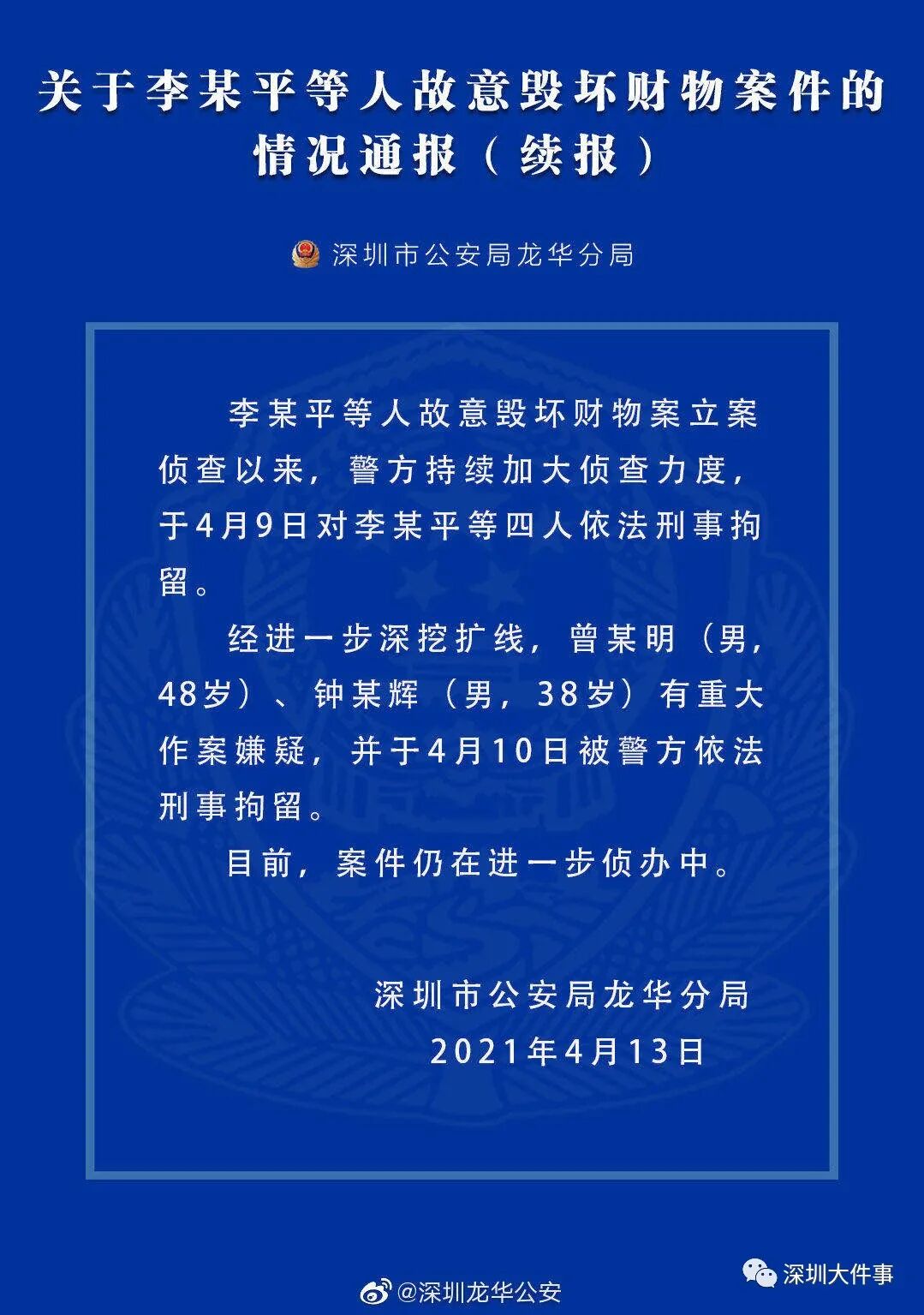 4月9日,深圳市公安局龙华分局发布通报称,嫌疑人李某平(男,49岁)、周某斌(男,25岁)、潘某波(男,28岁)、陈某(男,23岁)四人因涉嫌故意毁坏财物已被依法刑事拘留,案件仍在进一步侦办中。