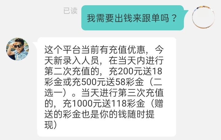 添加微信后,对方向刘女士讲解了相关工作流程(充值-刷单-提现),并表示现平台有充值优惠,充值200元赠送18元彩金,充值500元赠送58元彩金,充值1000元赠送118元彩金,彩金可随时提现。