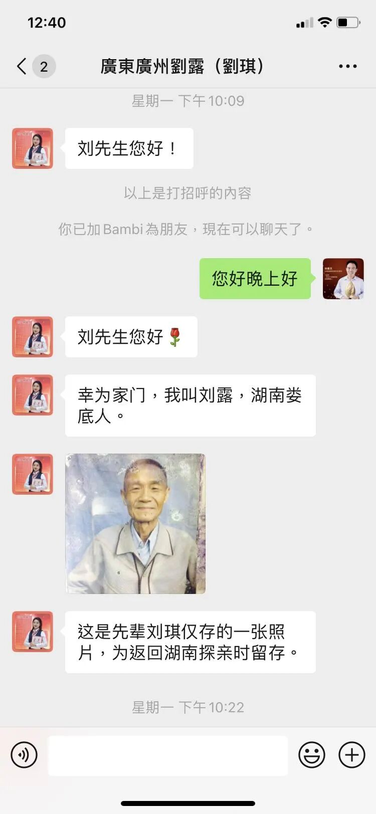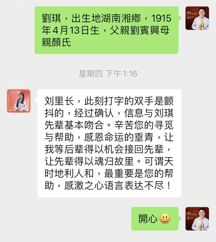 和许多网友一样,4月11日,刘露看到《阿伯,我背您回家》视频,感动之余,她想起自已的叔公刘琪也是一名赴台老兵,生前曾多次表示,希望去世后“叶落归根”。刘露告诉看台海记者,“把叔公的骨灰带回家,这也是我爷爷和父亲最大的心愿”。当天她联系上刘德文里长,刘里长一接到刘露的委托微信,立即根据她提供的相关信息进行查寻比对,先后到屏东、新北等地找寻,3天后最终在高雄的灵骨楼找到了刘琪老人的骨灰。