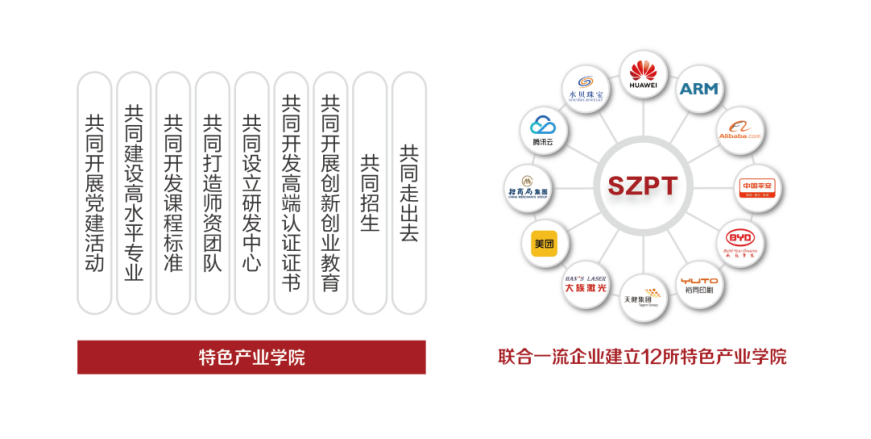 深圳职业院校还与华为、比亚迪、平安科技、阿里巴巴等世界500强或行业龙头企业紧密合作,建设一批特色产业学院,实施“六个共同”,即共同建设高水平专业、共同开发课程标准、共同打造师资团队、共同设立研发中心、共同开发高端认证证书、共同“走出去”,探索形成了适合中国国情的“双元”育人模式,到2022年将建成10个示范性特色产业学院。