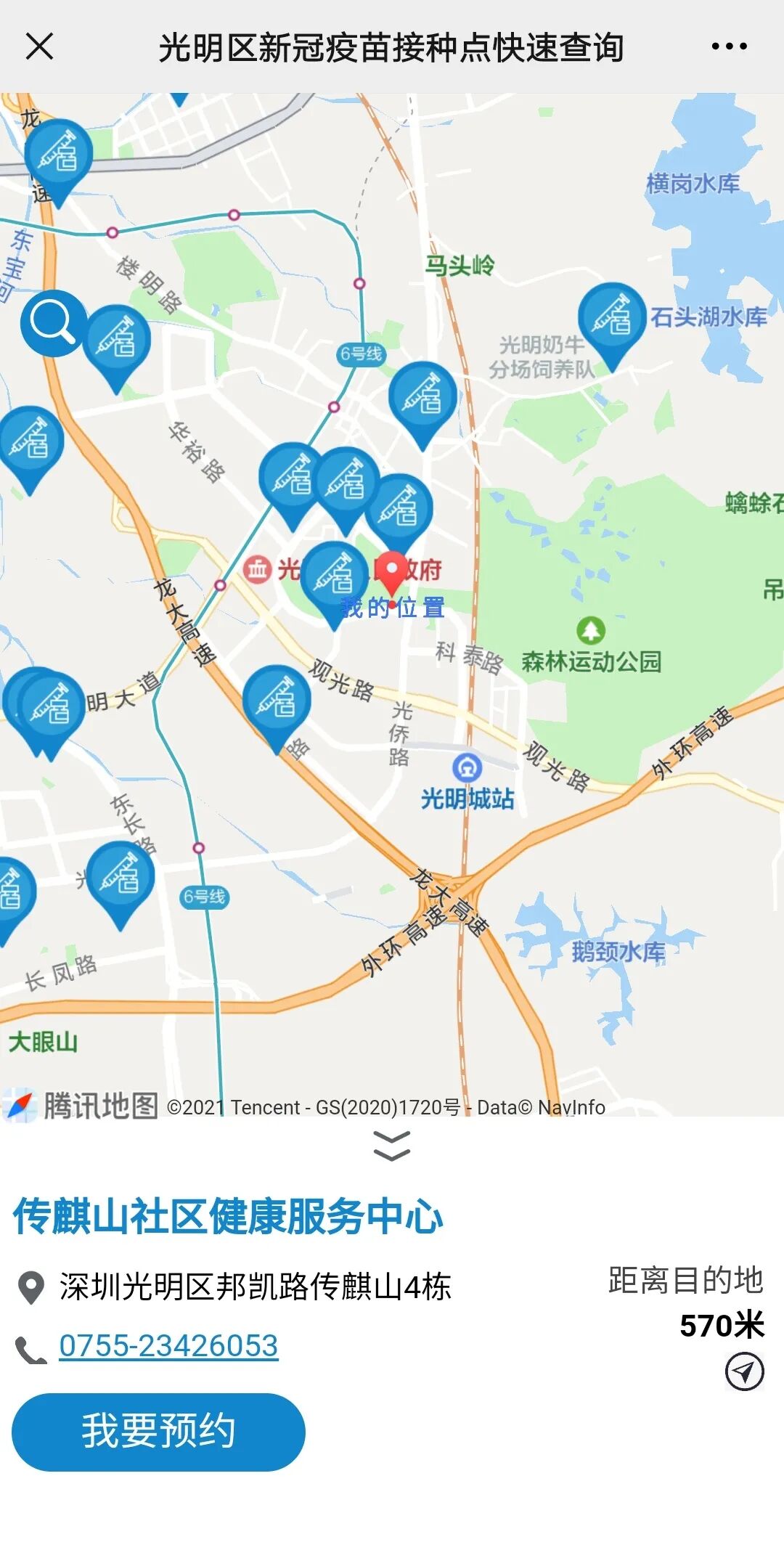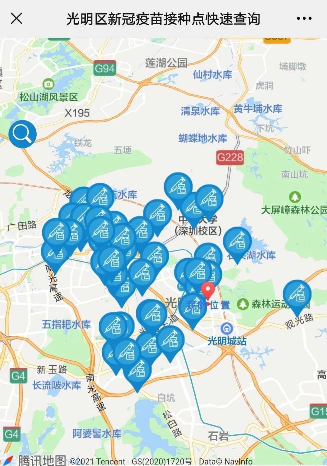 地图涵盖了光明区新冠疫苗全部接种点的地理坐标,用户点击进入地图,便可查询新冠疫苗接种点,并便捷地导航至距离最近的接种点,快速为光明居民提供疫苗接种指引。