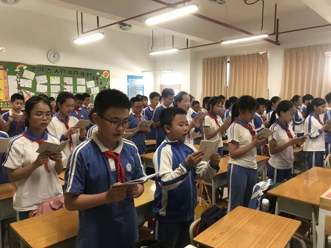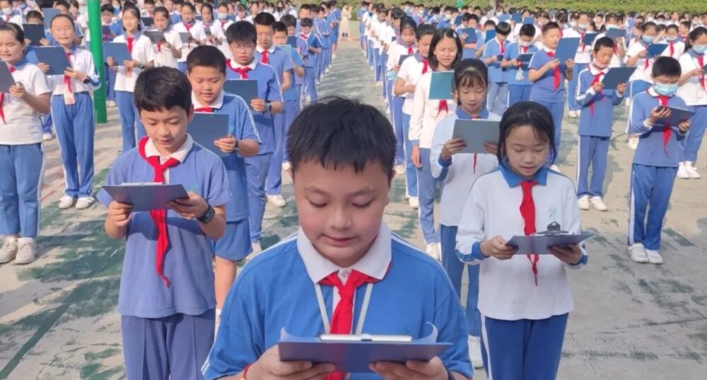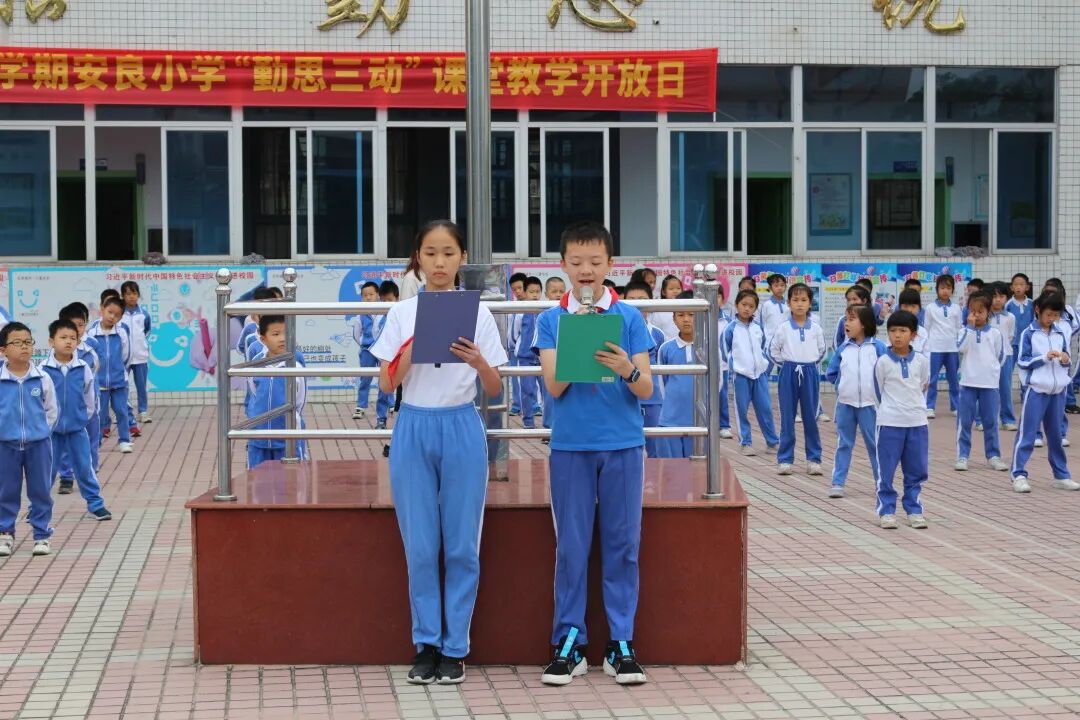 安良小学开展“我和书籍交朋友”主题队会。五(3)班的学生代表在升旗台下演讲,倡导同学们能与书籍为友,与经典同行。孩子们在班主任的带领下共读一本好书。