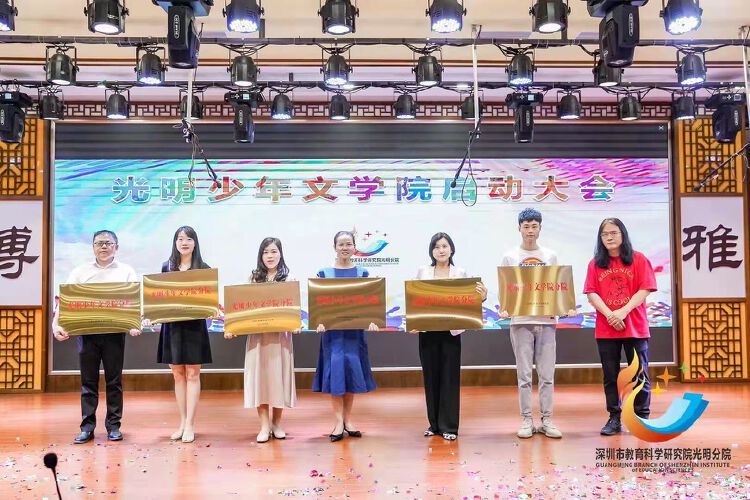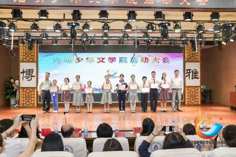 启动仪式上,区教育局、区文联、区教科院、分院代表的领导和“预备小院士”代表共同为光明少年文学院揭牌。胡野秋等9人受聘为光明少年文学院特聘导师,李松蓢学校等6所学校为光明少年文学院分院,蔡森宜等30位同学为光明少年文学院“预备小院士”,艾秋菊等11人受聘为光明少年文学院期刊编辑。