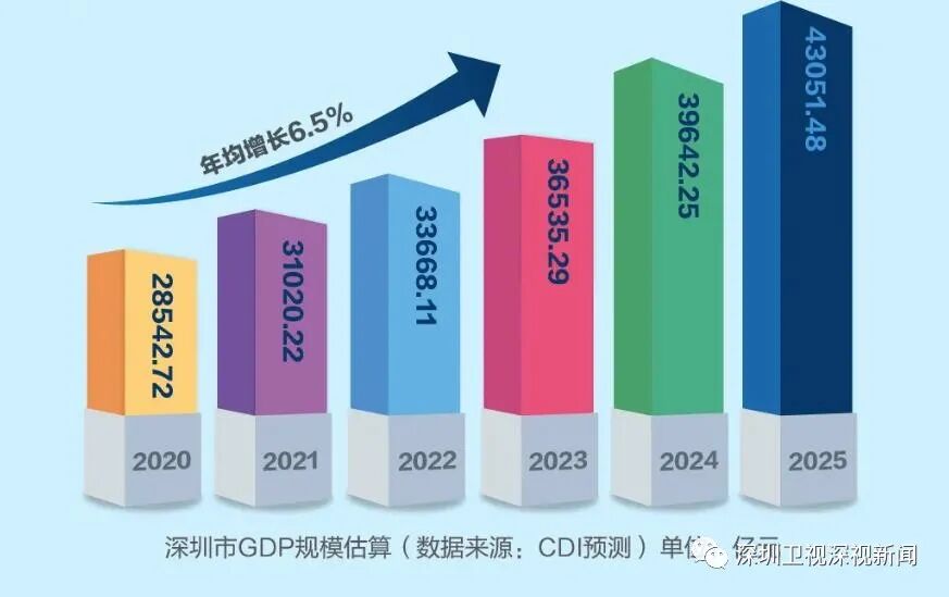 其发布的报告认为,在新消费和新科技企业带动下,未来5年,深圳GDP增速预计达到6.5%,到2025年总量达到4.2-4.5万亿。