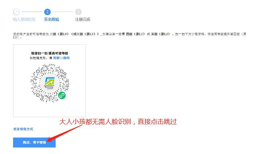进入下一步后(大人小孩都无需人脸识别,直接点击跳过)