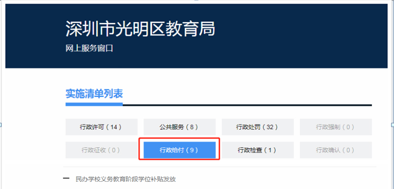 广东政务服务网首页左上角点击“切换”,选择“深圳市”→“光明区”→“光明区教育局”。点击“行政给付”→“民办学校义务教育阶段学位补贴发放”,点击“在线申办”。
