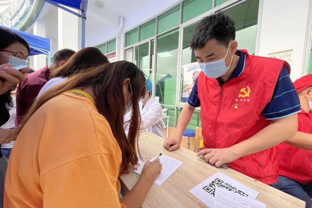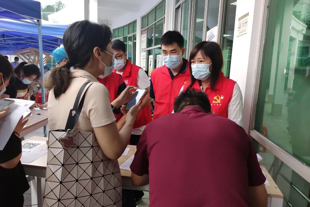 党员志愿者在疫苗接种现场维持秩序,指导群众有序接种