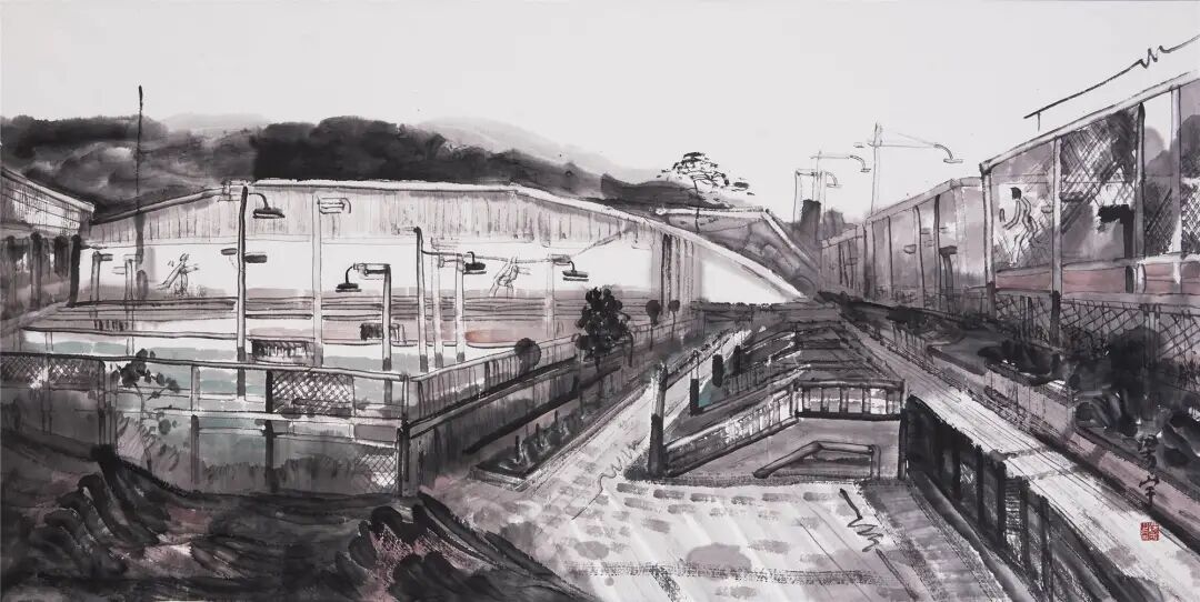 ▲梁宇《群众体育中心速写》