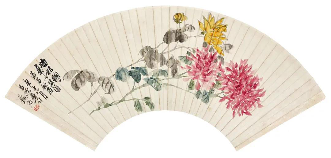 ▲“追梦”系列文化活动之“美抱福田——哈尔滨城史文物馆馆藏作品展”展出的吴昌硕画给爱子吴东迈的菊花扇面。
