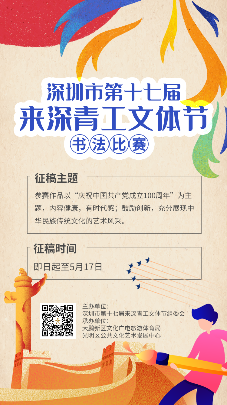 为热烈庆祝中国共产党成立100周年,为广大来深青工提供交流学习和展现艺术才华的平台,满足广大来深青工的文体需求,体现文体关爱,光明区文化馆将组织光明青工参赛,入围优秀作品将代表光明区参加深圳市第十七届来深青工文体节书法比赛终评。