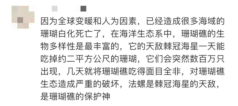 据了解,法螺是国家二级保护动物,作为长棘海星的天敌,是珊瑚的“保护神”。