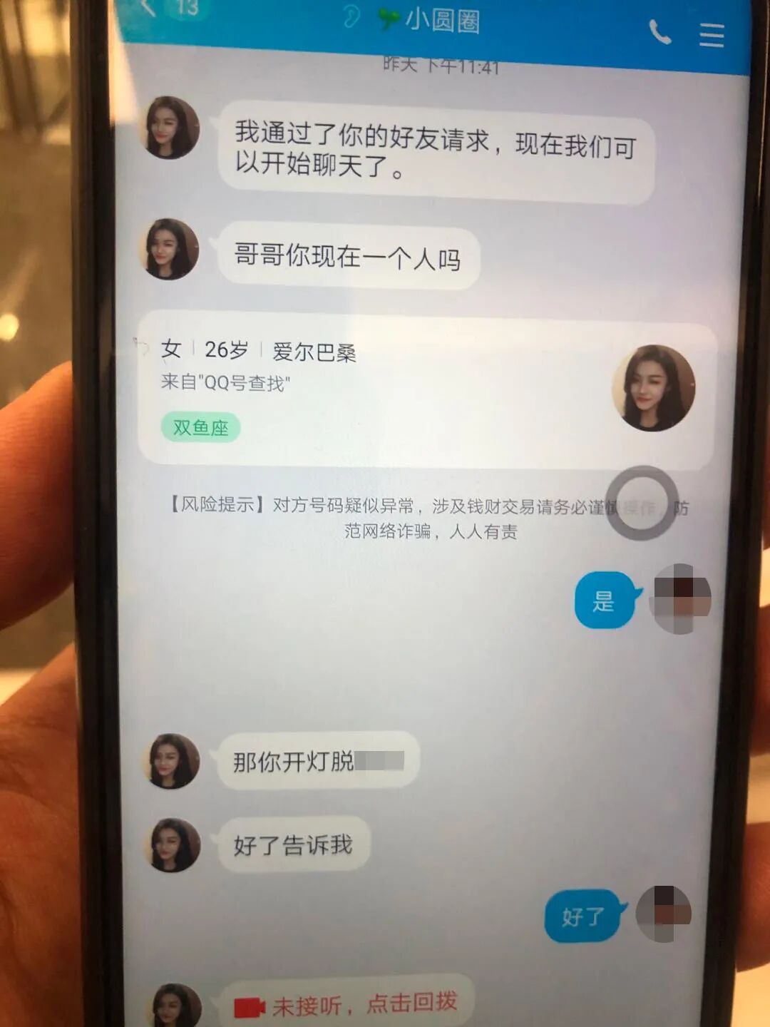经了解,雷先生近期在某社交平台上认识了一位好友,与对方聊天情投意合。一段时间后,两人聊天内容逐渐“丰富”,还会打打视频电话,视频的内容也很“露骨”。