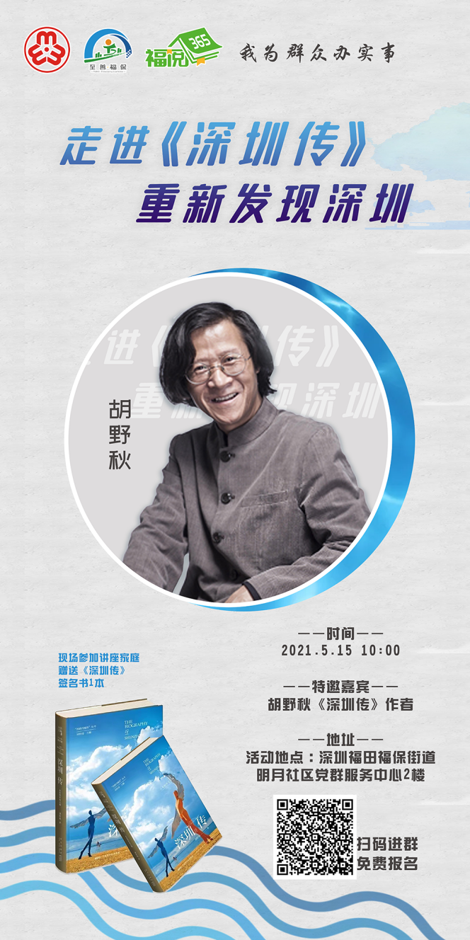 “福阅365”首场活动,将于国际家庭日(5月15日)当天,在福保街道明月社区党群服务中心2楼举行,届时《深圳传》作者胡野秋助力家庭阅读,带领福保家庭重新发现深圳。