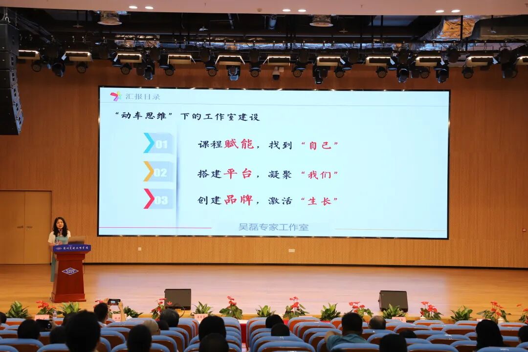 吴磊结合生动详实的案例,分享了她10多年来在名师工作室主持方面的宝贵经验,主要包括:课程赋能,找到“自己”;搭建平台,凝聚“我们”;创建品牌,激活“生长”。