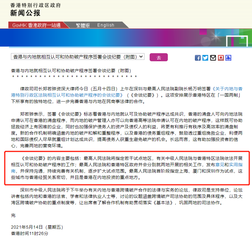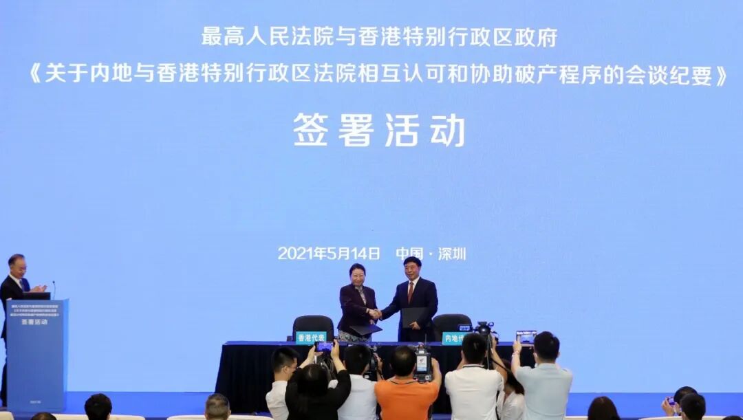 5月14日上午,最高人民法院副院长杨万明和香港特别行政区政府律政司司长郑若骅在深圳签署《关于内地与香港特别行政区法院相互认可和协助破产程序的会谈纪要》(以下简称《会谈纪要》)。当天下午,最高人民法院官方网站发布了《关于开展认可和协助香港特别行政区破产程序试点工作的意见》。