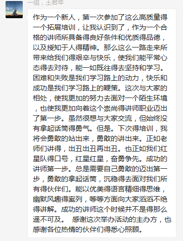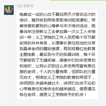 一天的学习很快结束,大家意犹未尽,课余依旧在琢磨和钻研。“孙老师的课太有用了,解决了我之前上台紧张和站姿的诸多问题。” 学员梁燕云分享到。晚上,大家围坐一起,观看《觉醒年代》片段,大家很多感触。学员孙爱静分享到:“片中陈独秀说:国之不昌,在于民智未开。可见思想引领大众的重要性。作为一名义工讲师,就是要把志愿精神传播给广大义工和市民,让大家在志愿服务中更加规范、更多传承”。