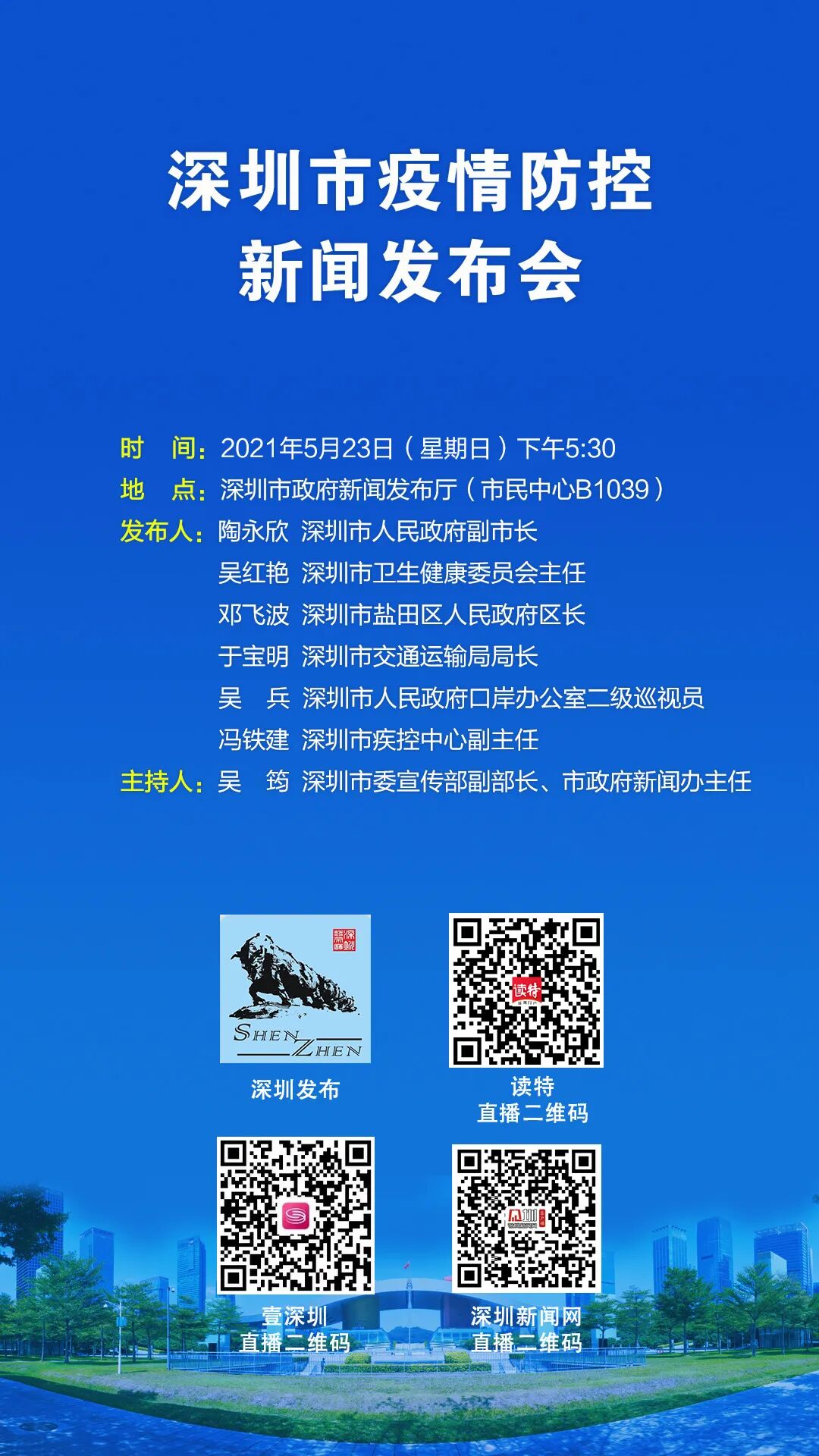 2021年5月23日下午5:30,深圳市将举行疫情防控新闻发布会,深圳市政府副市长陶永欣,以及市卫生健康委主任吴红艳、盐田区区长邓飞波、市交通运输局局长于宝明、市口岸办二级巡视员吴兵、市疾控中心副主任冯铁建将出席发布会,通报我市疫情防控最新情况,介绍防控工作措施,并回答记者提问,敬请关注。