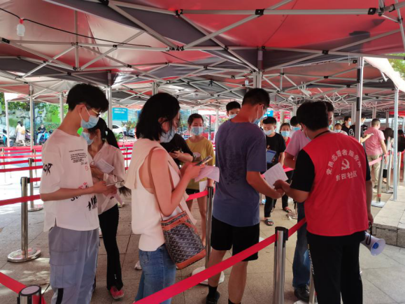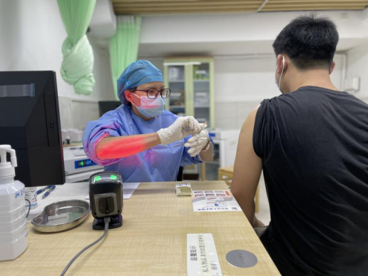 “天气太热,我们就会为群众发放矿泉水,没有吃早餐的群众还会送上一个小面包。”据新田社区工作人员介绍,上午,该接种点1200支疫苗已全部预约完毕,全天进行有序接种,工作人员针对排队超过30分钟的群众赠送矿泉水,遇到早上没有吃早餐的市民,还会赠送一个小面包。在留观区域,该接种点增设一台电视机,工作人员会播放交通安全等宣传视频,市民也可点播新闻联播、电影等消磨时间。