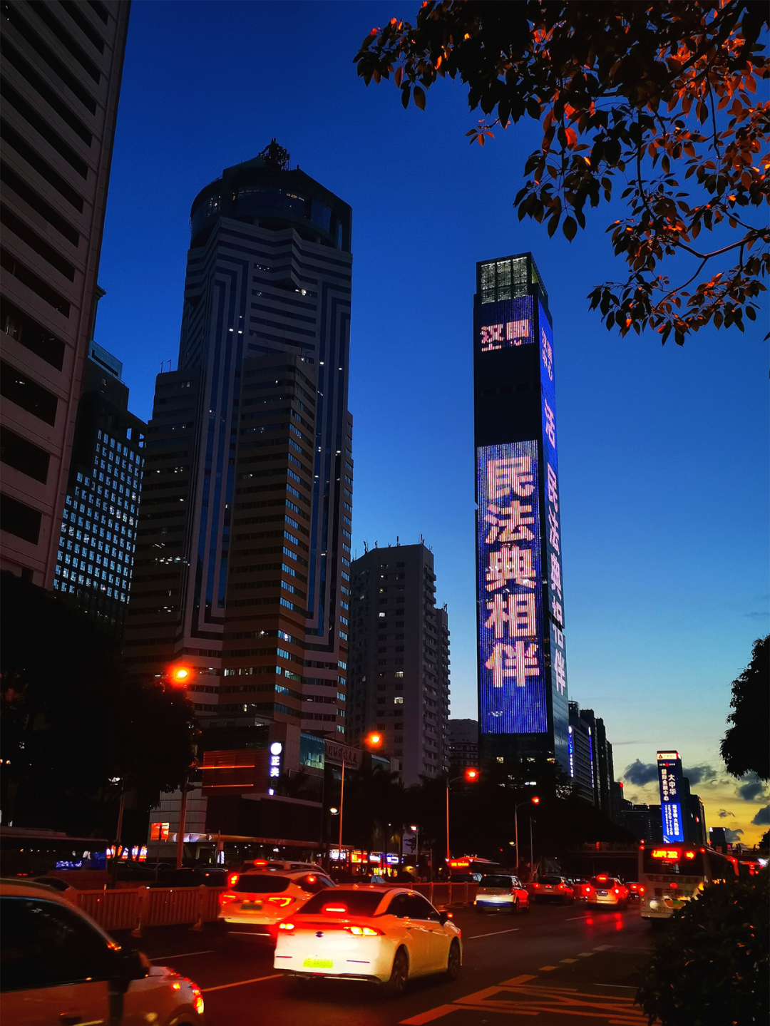 在夹杂着金蓝两色的霞光映照下,《民法典》宣传标语缓缓上升,点缀着深圳的夜空,也照耀着每一位市民。让大家充分感受到徜徉在民法慈母般眼里的温暖。