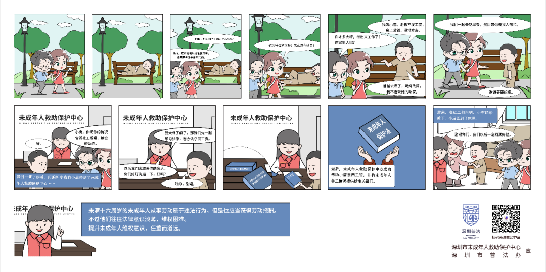 对青少年的普法教育从来都是深圳普法人的工作重点,在法治宣传普及过程中,青少年更是不可忽视、十分重要的普法群体。因此,除了宣传《未成年人保护法》外,深圳还把《民法典》作为青少年法治教育中不可缺少的“重要一课”。此次,深圳市普法办更是与深圳市未成年人救助保护中心合作制作、推出了两款宣传未成年人保护的漫画。