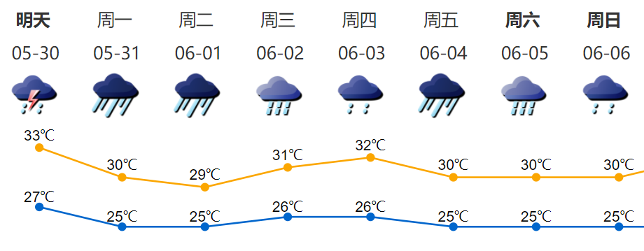 30日有雷阵雨,局部暴雨,雨时伴有6-7级阵风,气温27-33℃;