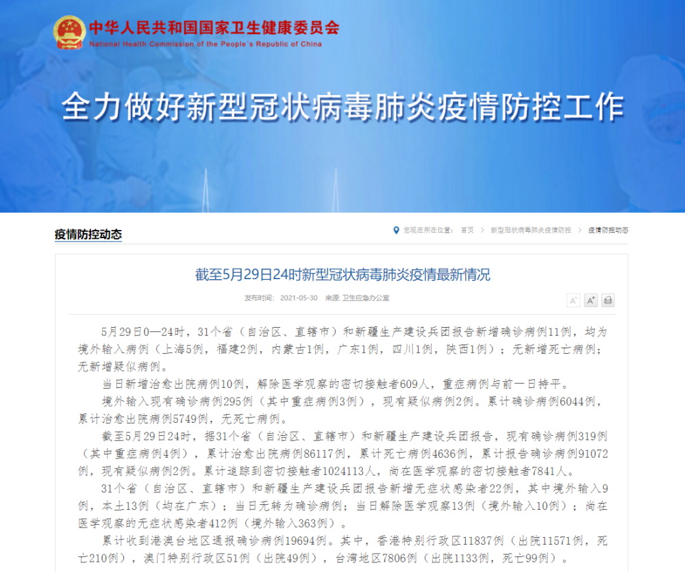 5月29日0—24时,31个省(自治区、直辖市)和新疆生产建设兵团报告新增确诊病例11例,均为境外输入病例(上海5例,福建2例,内蒙古1例,广东1例,四川1例,陕西1例);无新增死亡病例;无新增疑似病例。