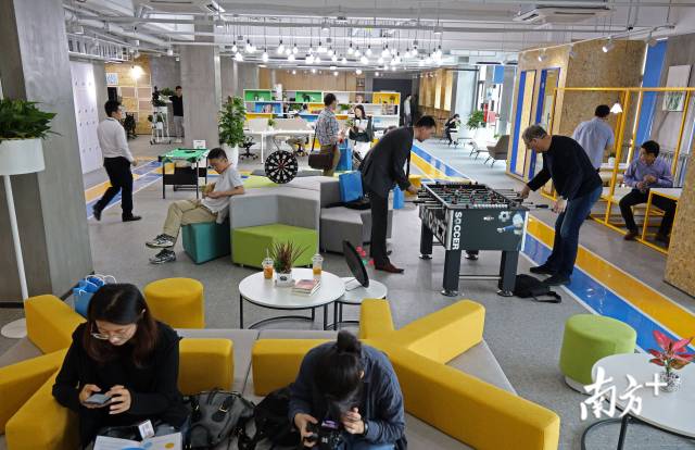 “海归岛”开放式办公环境,搭配个别私密的小房间,桌球台、桌上足球机、微波炉等消遣和餐厨设备一应俱全。 南方日报记者 何俊 摄