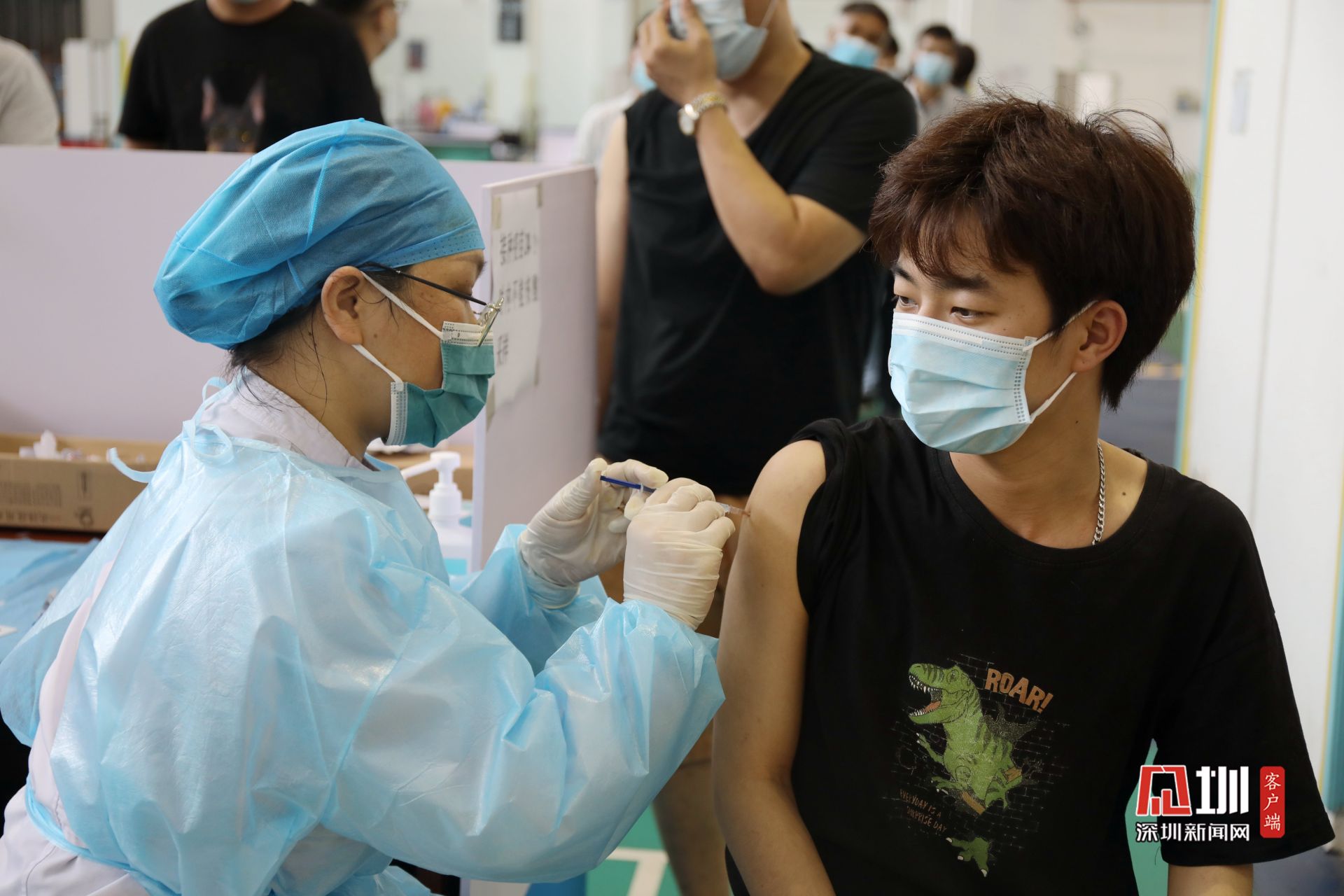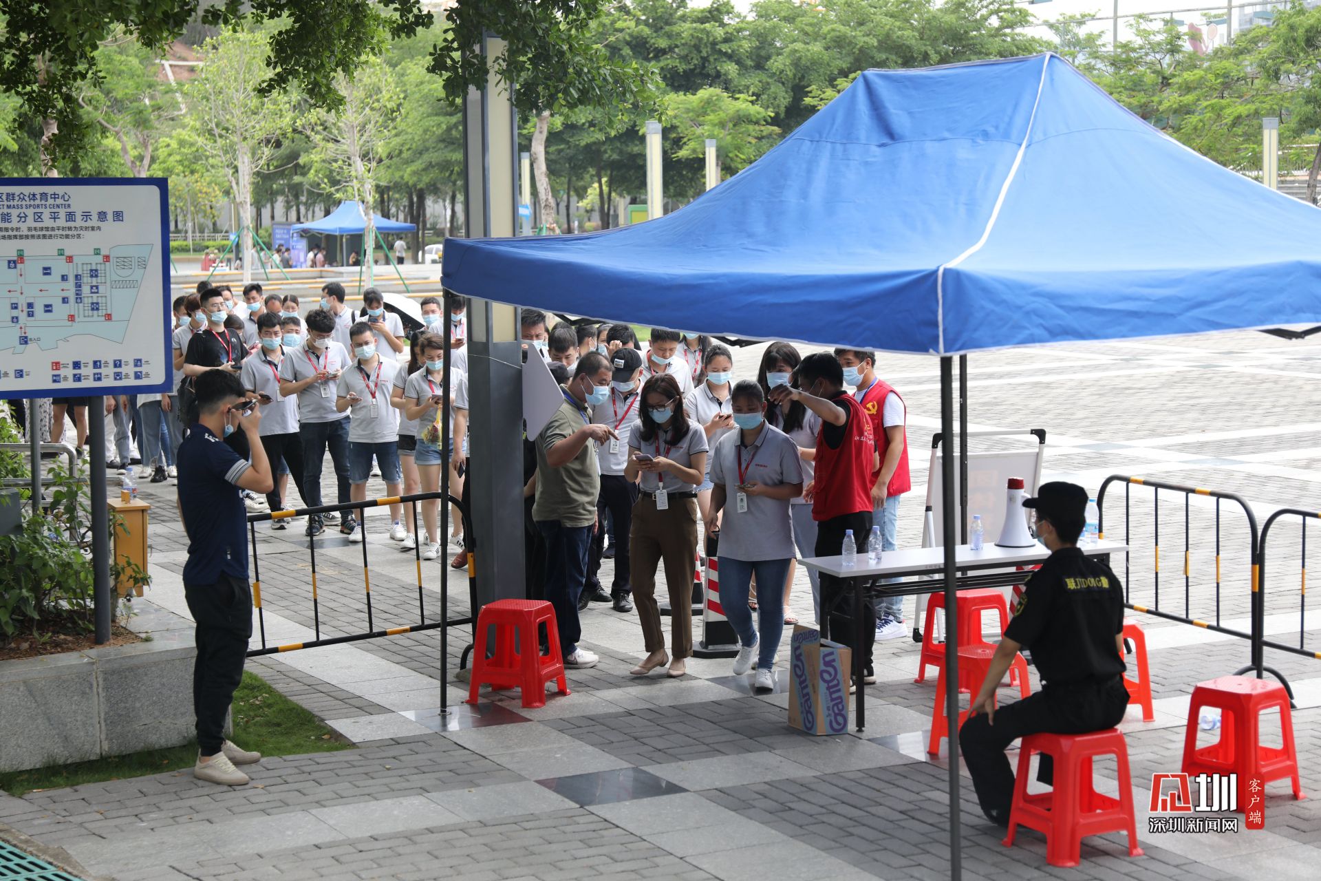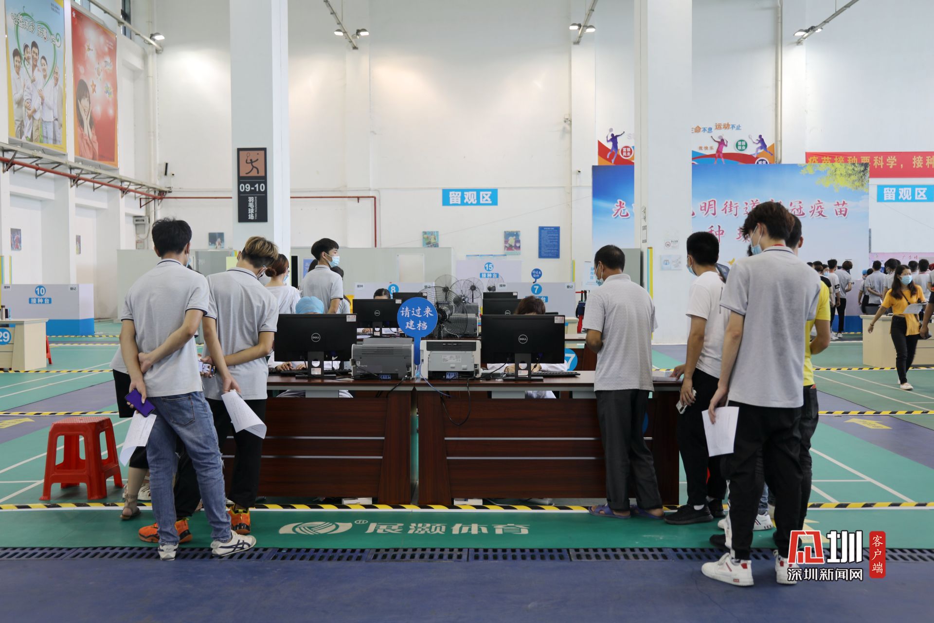 5月31日上午,光明区群众体育中心新冠疫苗临时接种点,前来接种疫苗的人们在工作人员引导下有序排队,现场问询处、建档区、接种区和留观区,各功能区严格划分,秩序井然。