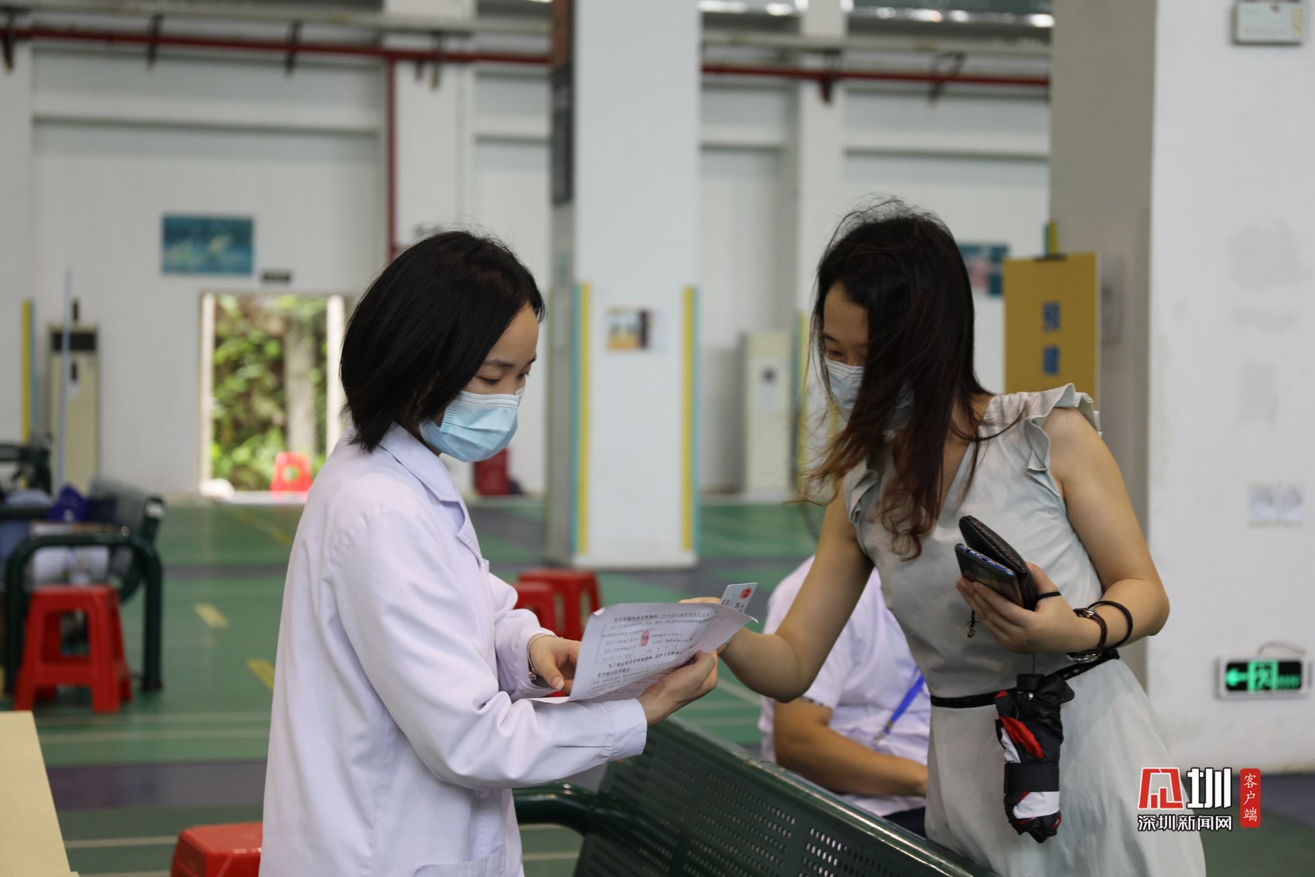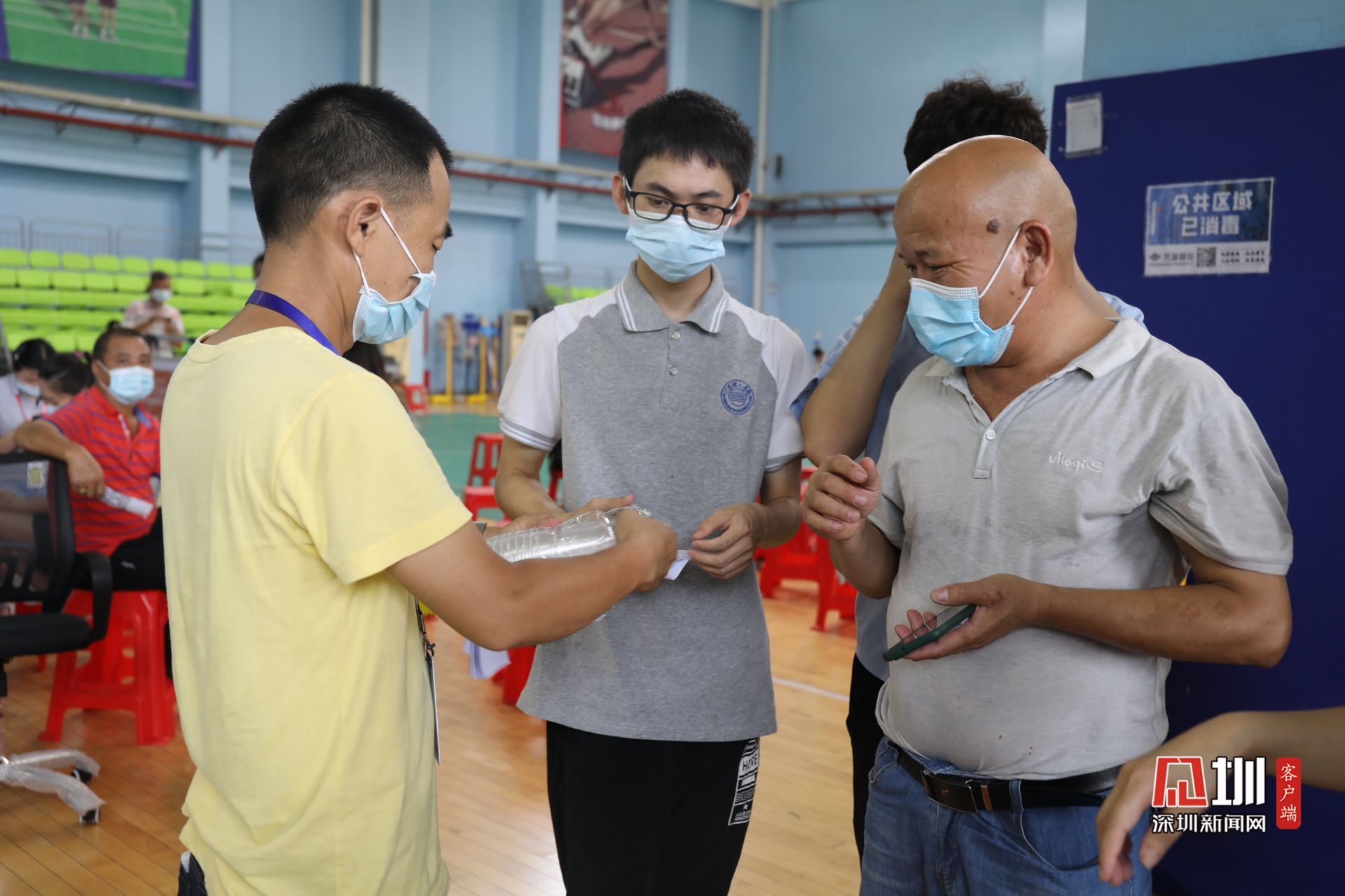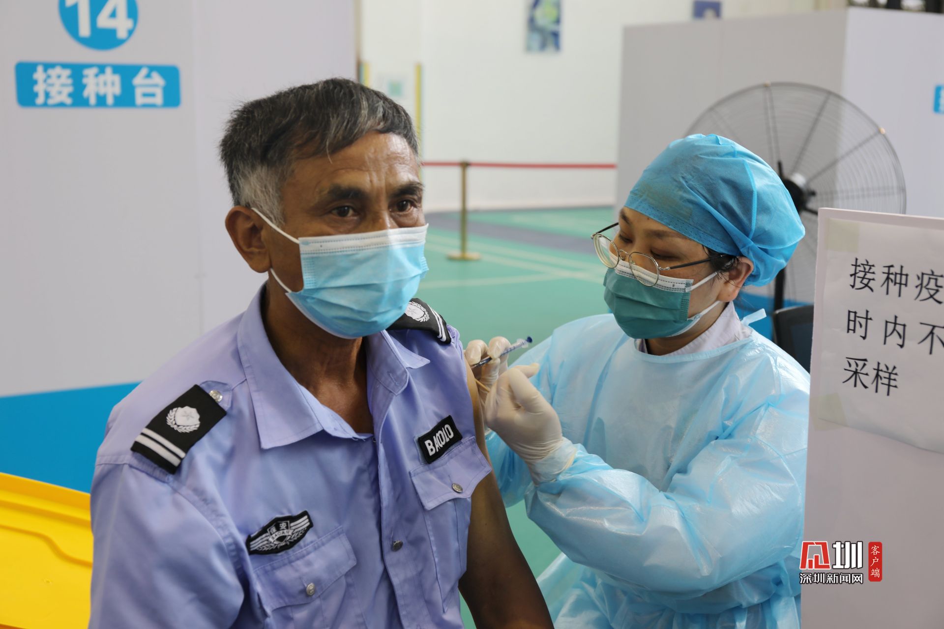 5月31日上午,光明区群众体育中心新冠疫苗临时接种点,前来接种疫苗的人们在工作人员引导下有序排队,现场问询处、建档区、接种区和留观区,各功能区严格划分,秩序井然。