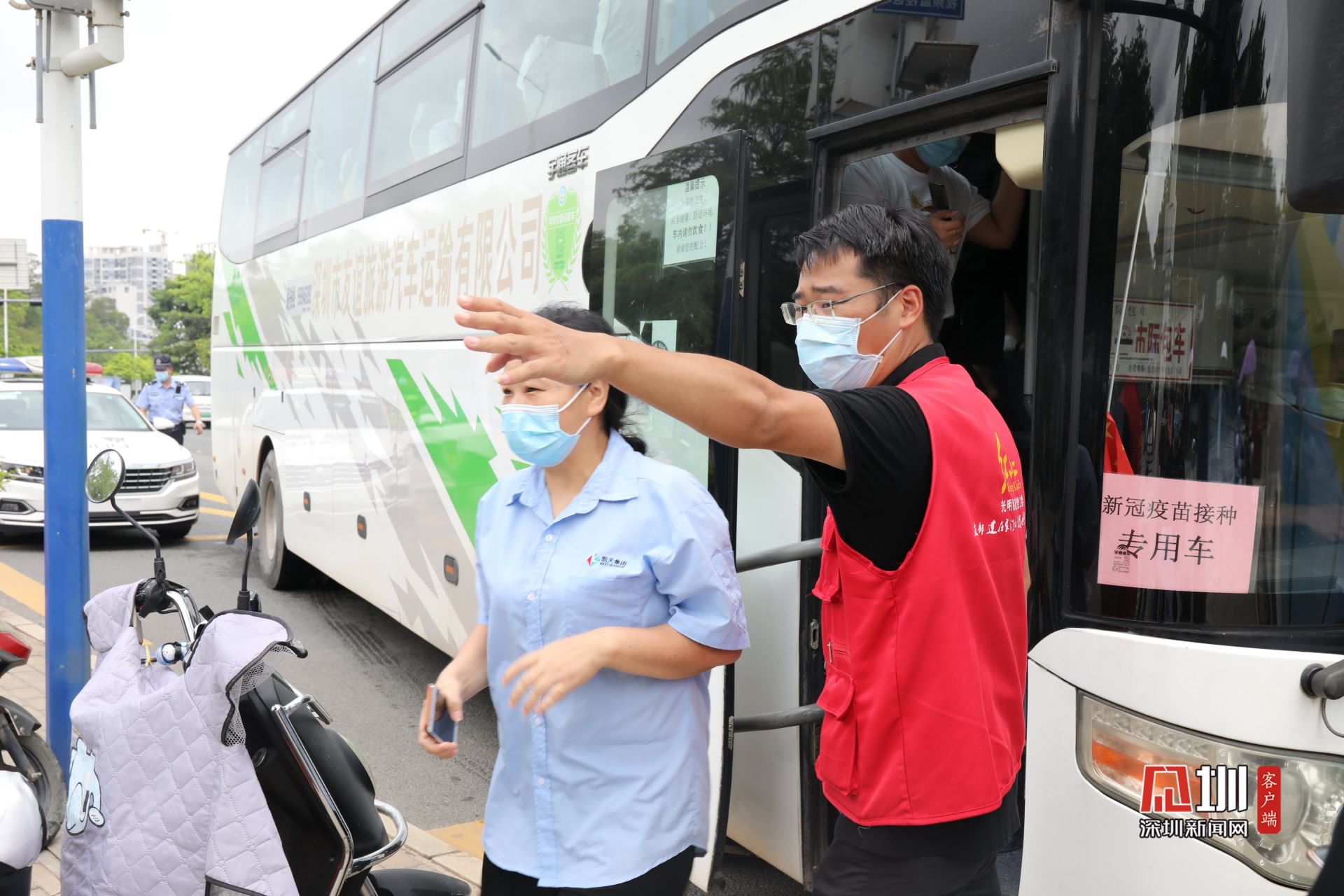接种结束后,居民有序排队上车。