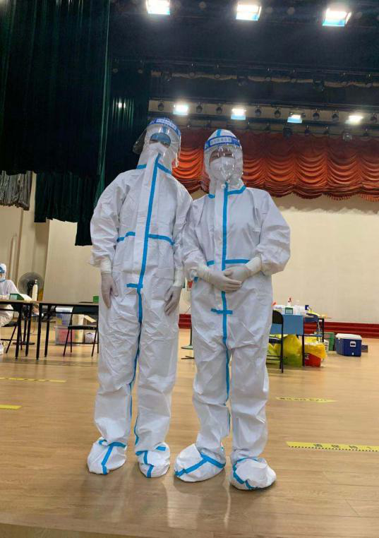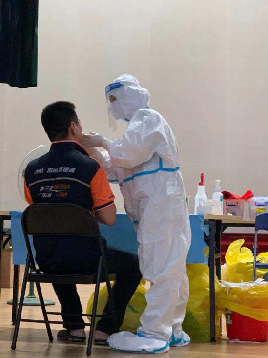 采样当天,两位医生全程专心致志,严格按照相关操作规程开展工作,虽然穿戴着密不通风的防护服和防护面罩,但依然面带笑容,态度可亲,顺利地完成了核酸采样任务。