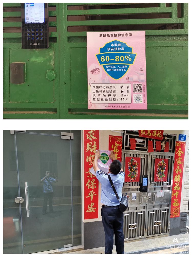 三是坚持横向联防,通过新冠疫苗接种信息牌,推进疫苗接种工作。对每户、每栋居民楼开展摸底行动,掌握人员接种情况,在楼栋下张贴新冠疫苗信息牌,对本楼栋适宜接种人数、已接种人数及接种完成率进行公示,按整体接种完成率将其分为红、蓝、绿等5个颜色,实行全民监督,保证疫苗接种不漏一人,共同提升社区接种率。