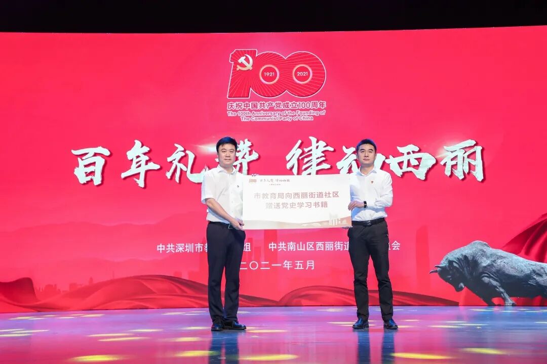 市教育局党组成员、副局长于洋,西丽街道党工委书记潘军出席活动,机关在职党员与西丽街道、社区党员干部、市第二高级中学师生共同聆听了这场特别的党课。于洋代表市教育局向西丽街道和市第二高级中学分别捐赠百本党史教育红色书籍。