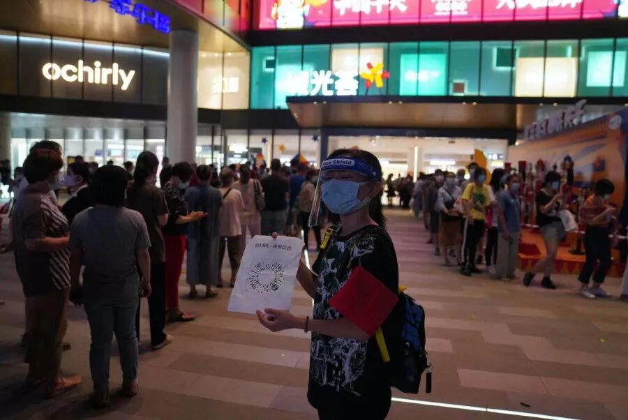 2021年5月26日,广州荔湾,城光荟商场外,工作人员举起二维码,供前来做核酸检测的市民填报个人信息。 (南方周末记者 翁洹/图)