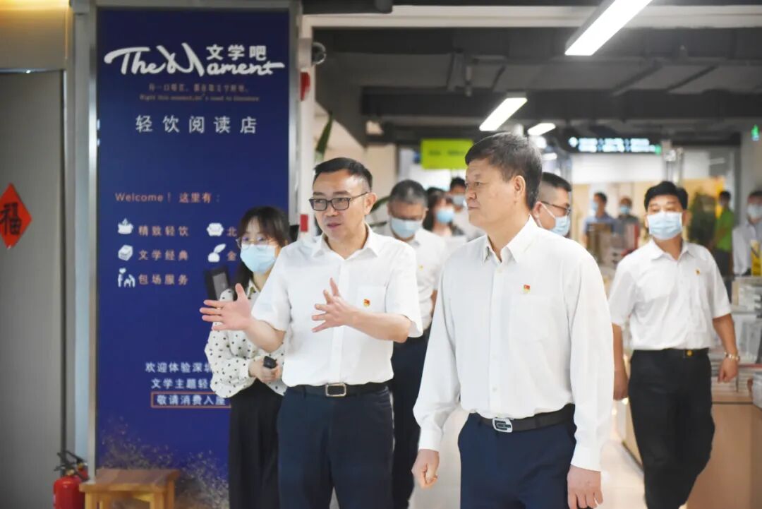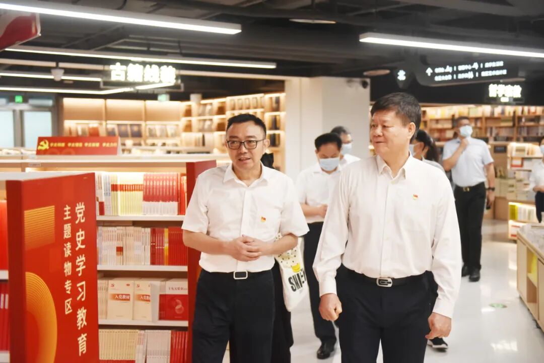 指导组一行参观了中心书城综合书店、24小时书吧、AI智能互动屏、益文书局等场所,体验了书城内各类党建、党史学习教育互动场景,感受浓厚的党建、党史学习教育氛围,现场认真询问了党史学习教育主题图书发行情况,了解了集团党史学习教育推进情况。