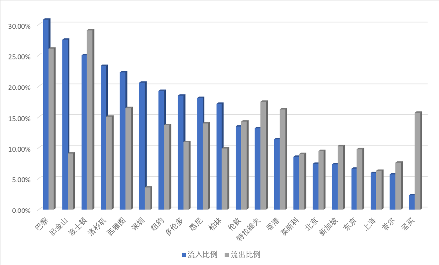 从流出比例来看,深圳则低于5%,不仅低于国内其它城市,在全球20座科技创新中心城市也是最低。
