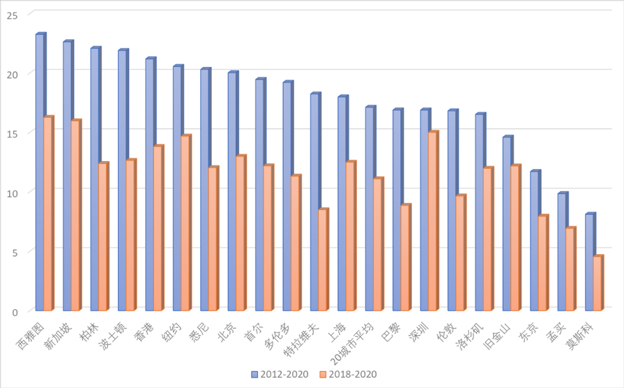 全球20座科技创新中心城市青年科学家2012-2020年学术发展曲线