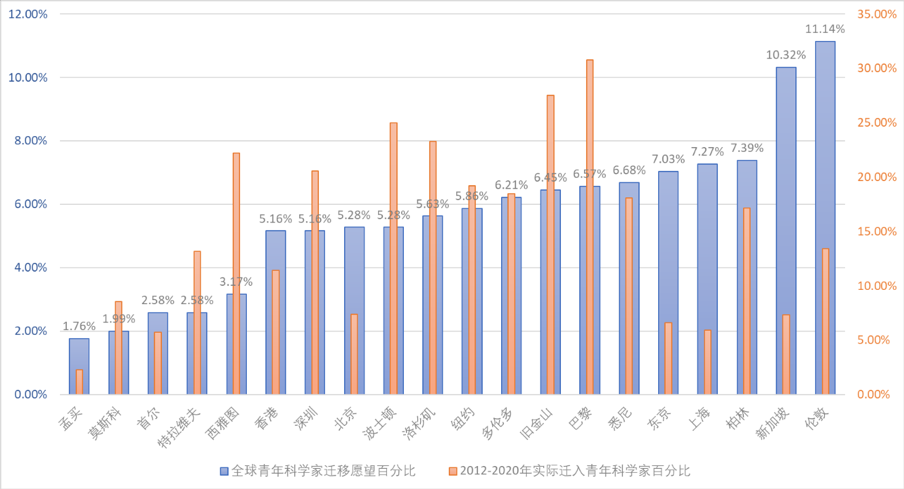 全球20座科技创新中心城市2012-2020年青年科学家流入流出比例