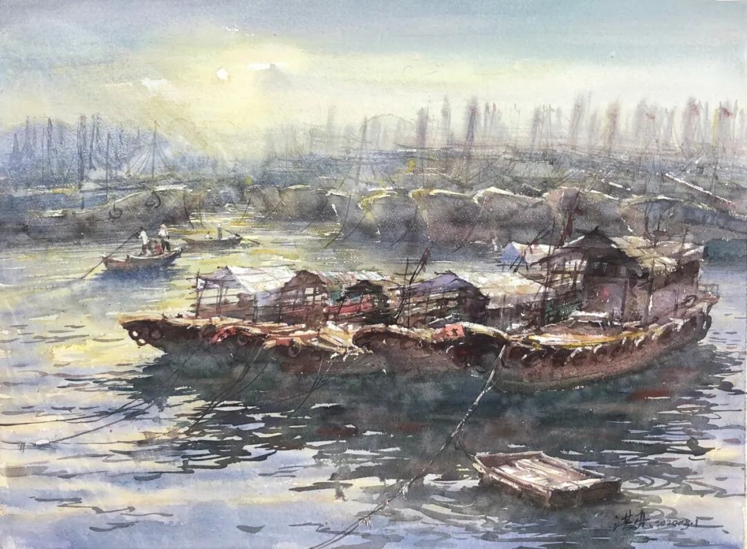 张洪亮《闸坡渔港写生系列——晨曦》76cm×56cm 纸本水彩 2020年