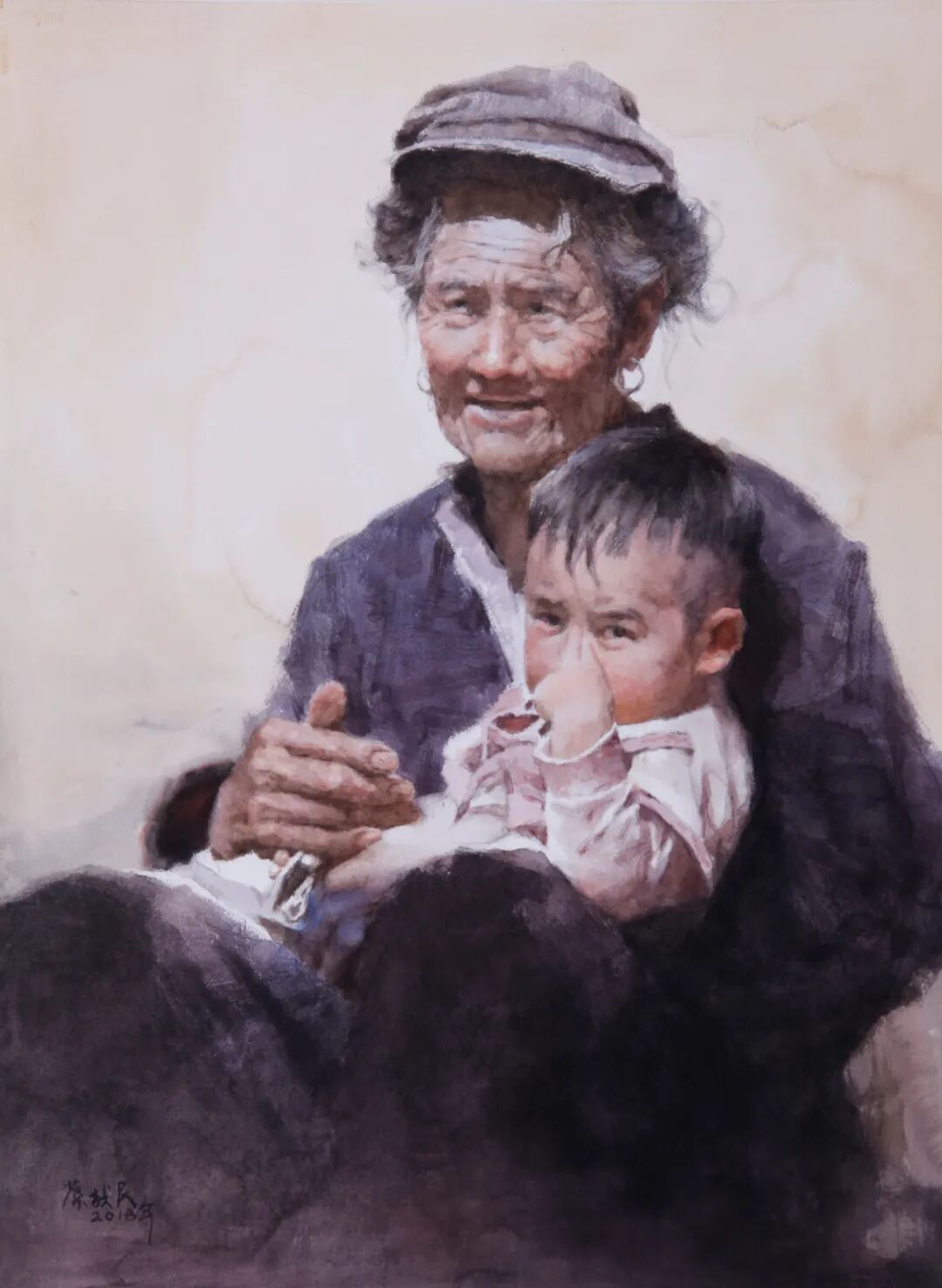 叶献民《婆孙》78cm×55cm 水彩 2018年