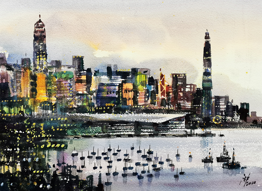 沈平(香港)《维港之夜》28cm×38cm 水彩