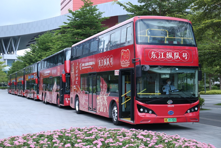 仪式结束后,六辆红色旅游巴士从深圳市当代艺术与城市规划馆出发,搭载金牌导游和见证者,分别驶向六条红色旅游线路。这六条红色旅游线路,囊括了深圳30个主要的红色资源点,每条红色旅游线路均有自身的主题特色,分别为:“改革开放再出发”“春天的故事”“东纵峥嵘岁月”“赤诚初心”“解放思想 勇立潮头”和“红色足迹”。