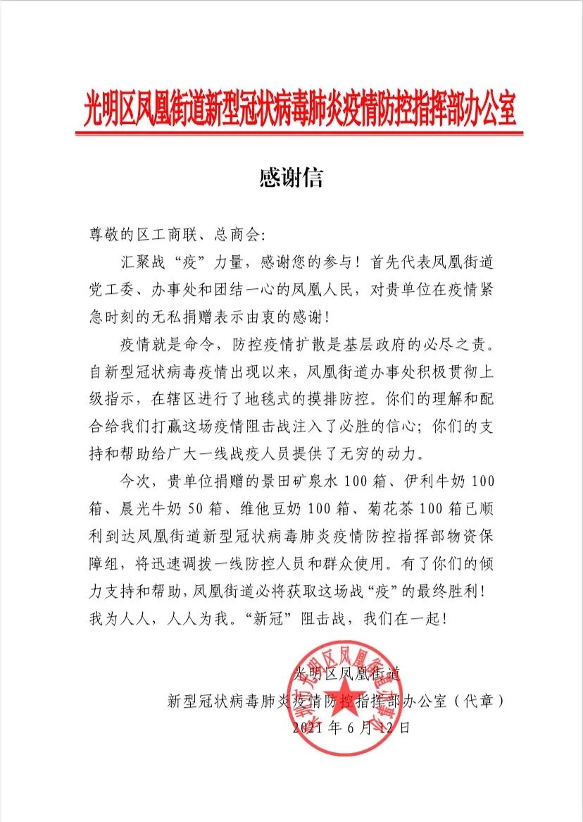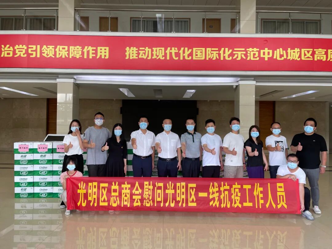 为向坚守岗位、奋战一线的防疫工作人员表示关爱和感谢,6月12日上午,光明区总商会向光明区一线防疫工作人员捐赠防暑降温物资2700余件。光明区工商联(总商会)副主席李楚乔、常委李献东出席捐赠仪式。