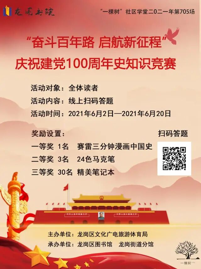 2021年是中国共产党成立100周年,为庆祝建党100周年,龙岗街道图书馆举办了“奋斗百年路 启航新征程”党史知识竞赛活动。通过线上答题,让广大读者更加深入的了解党史,激发民众的爱国热情和民族凝聚力。