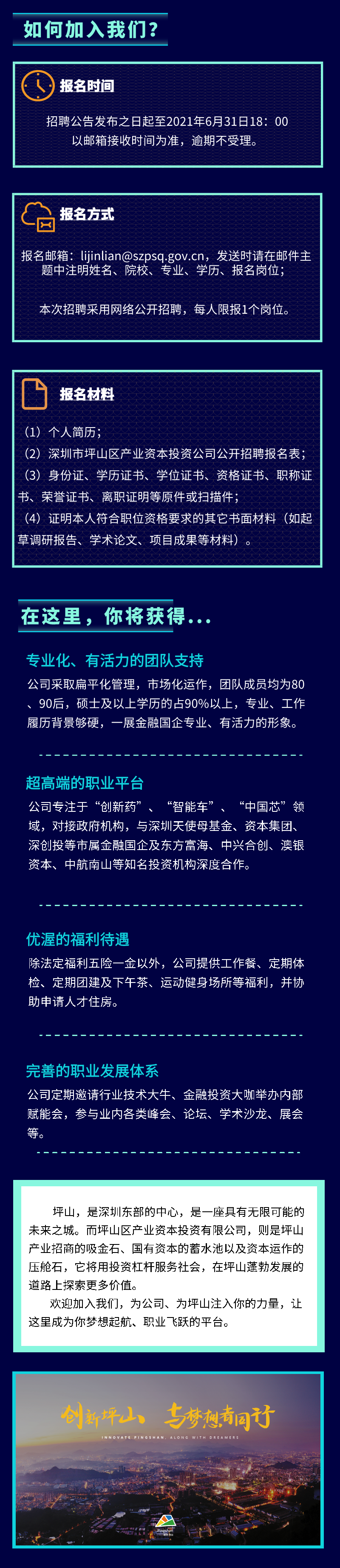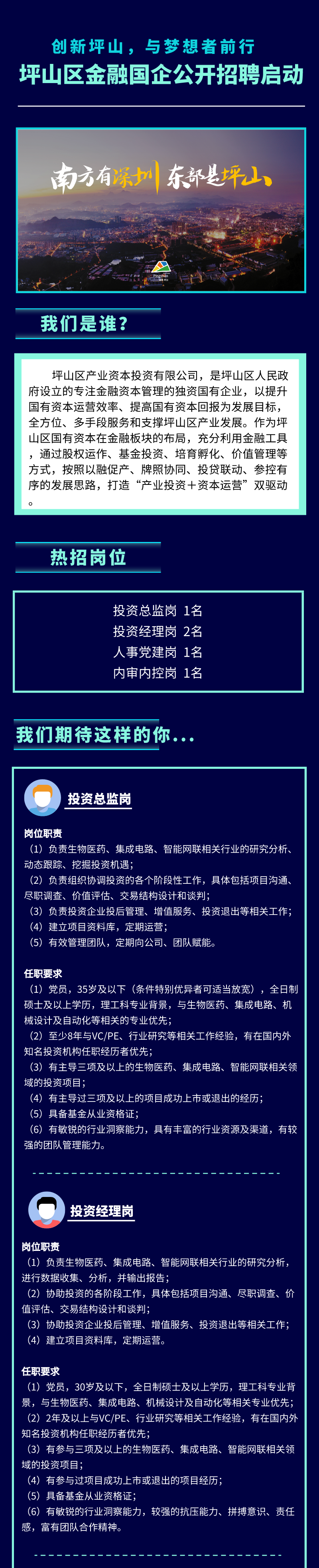 创新坪山,与梦想者前行。欢迎有能力的小伙伴们毛遂自荐,一起来看看吧!