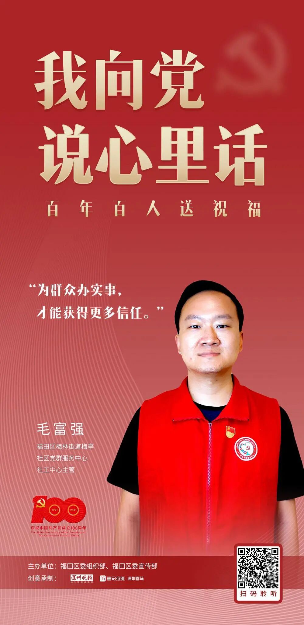 大家好!我是毛富强,我来自河南洛阳,2007年11月加入中国共产党,现在是福田区梅林街道梅亭社区党群服务中心社工中心主管。