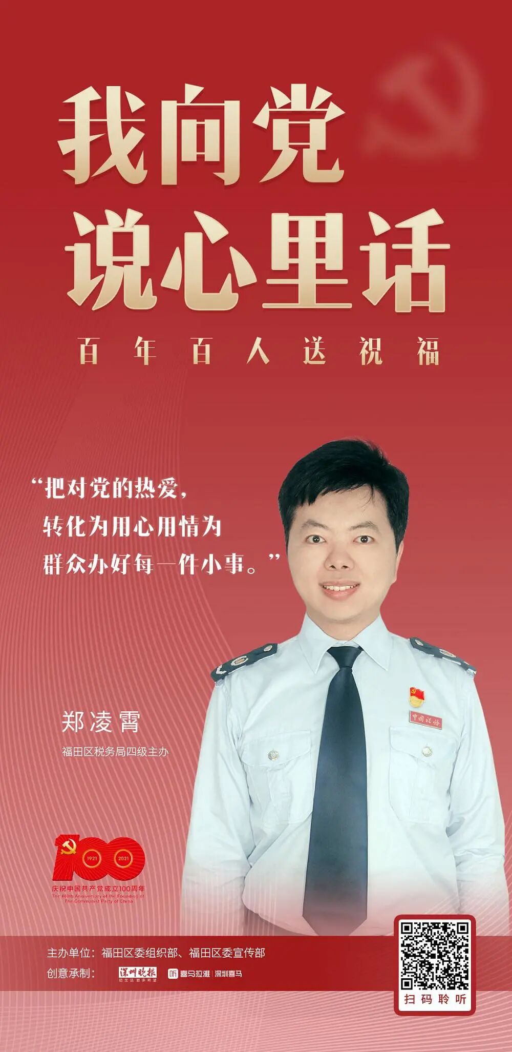 大家好!我是郑凌霄,来自河南南阳,2019年10月加入中国共产党,现在是福田区税务局办税服务大厅的四级主办。