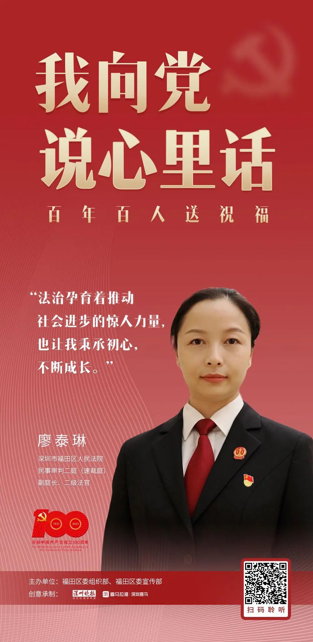 大家好!我是廖泰琳,来自湖北恩施,2003年6月加入中国共产党,现在是深圳市福田区人民法院民事审判二庭的一名法官。