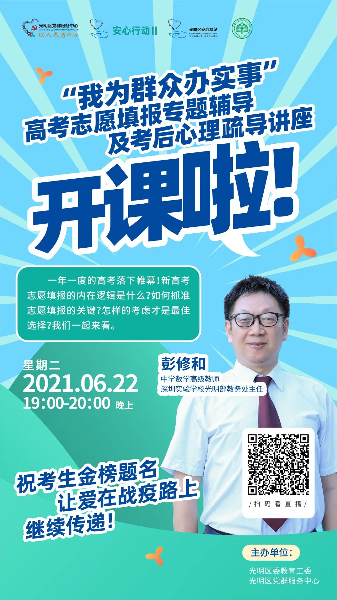 今年是广东省新高考改革实施方案的第一年为了进一步帮助考生及家长了解新高考做好2021年高考志愿填报工作深入开展“我为群众办实事”活动特举行光明区高考志愿填报专题辅导讲座有需要的家长和同学千万不要错过哦~